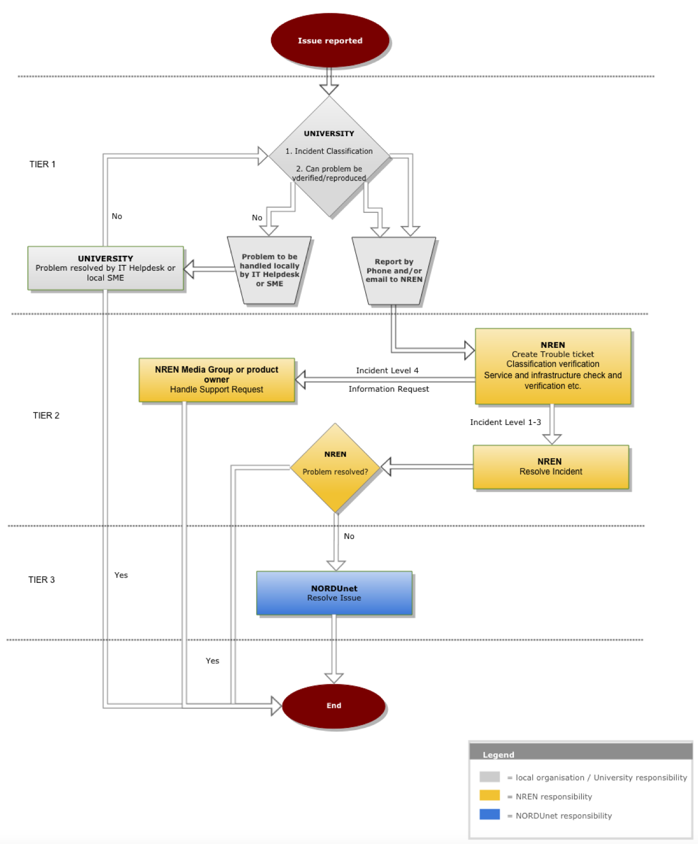 Tier 1 individually specify their requirements for how incidents are to be reported. Incidents escalated to NORDUnet Media/Tier 3 must contain the information included in the description under “5 Incident registration and verification”.